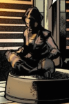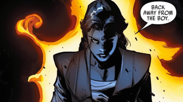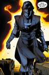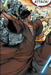 I find it really interesting that when she’s leading on the front line, Depa Billaba is so exposed. Her costume is soft, in-keeping with her TPM costume – what looks to be a long tunic or dress, possibly over trousers, soft boots which look to be some sort of tabi-boot in certain panels, and bare wrists. (The first flashback splash page shows Depa with wrappings like Caleb’s, but that… entire costume, really, appears to be out of ocntinuity with the rest of the comic.) Her shoulders, neck and chest are entirely exposed, just like tiny Caleb all the better for being killed by clones. But here on Kaller she’s a woman who has doubts – in the war and in the choices made by her Order – but not in herse