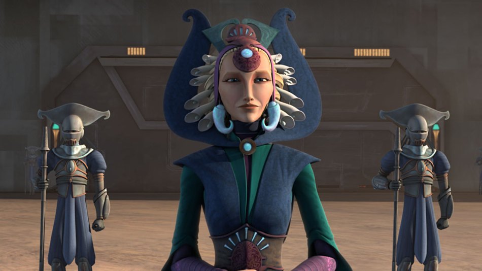 Duchess Satine Kryze is pacifist the ruler of Mandalore first introduced in The Clone Wars episode The Mandalore Plot. Her initial design was drawn from an unused McCaig concept for The Phantom Menace, but it has also been stated that Cate Blanchett was a key influence in her overall design. (given the appearance of Governor Pryce in Rebels season 3, it’s apparent that Blanchett is someone’s favourite over at LFL.) Blanchett’s role as Queen Elizabeth I was particularly drawn on, Satine’s key costuming borrowing many late Tudor/early Elizabethan elements, and certain parallels between the two women’s lives.